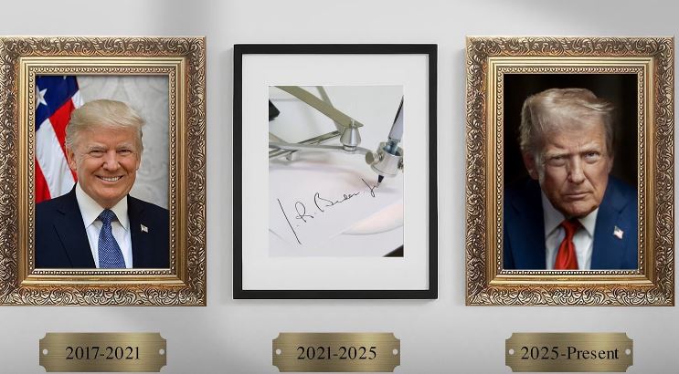 Në imazh shfaqen tre korniza: një me portretin e Trump (2017–2021), një tjetër me një makinë autopen (2021–2025), dhe e fundit sërish me portretin e Trump (2025–sot).