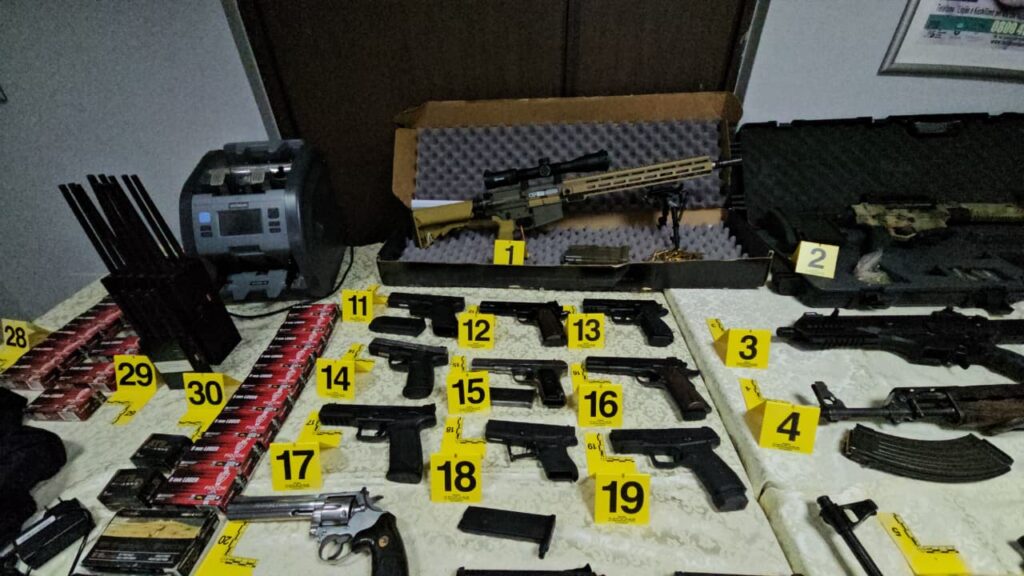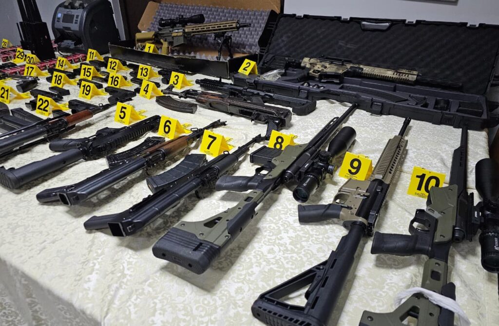 Në pamje shihet se janë gjithsej 23 armë, mes tyre sniper, municion luftarak dhe uniforma policie.