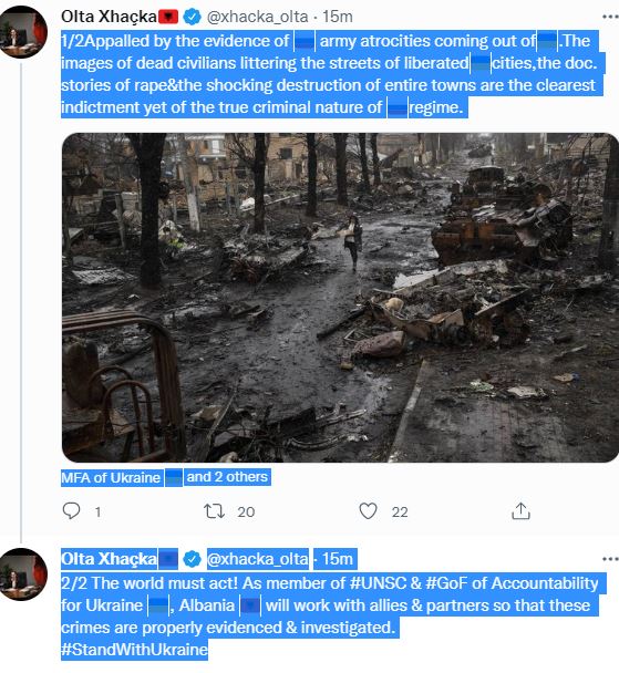 Ministrja e Punëve të Jashtme të Shqipërisë, Olta Xhaçka ka reaguar pas sulmit brutal të forcave ruse në qytetin e Ukrainës, Bucha, ku mbetën të vrarë 20 persona.