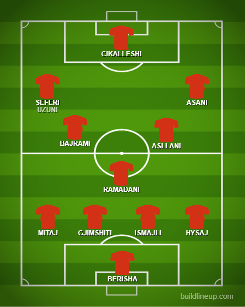 Me modulin 4-3-3 në portë do të luajë kapiteni Etrit Berisha, në krahun e djathtë të mbrojtjes Hysaj, në të majtë Mitaj, në zemër të repartit difensiv do të operojnë Ismjali dhe Gjimshiti.