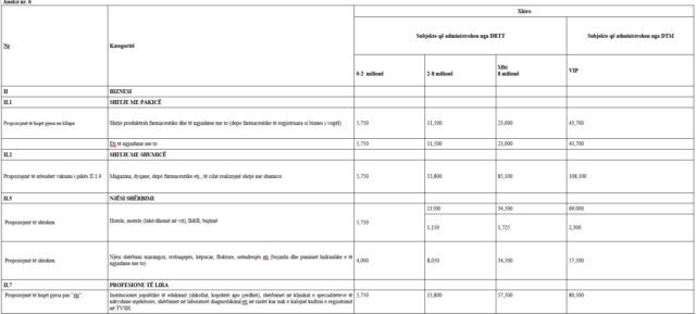 Për bizneset me xhiro nga 2 deri 8 milionë lekë është 4,000 lekë në vit. Për biznesi të kategorizuar në xhiro mbi 8 milionë lekë tarifa llogaritet 17,000 lekë në vit. Dhe për bizneset VIP taksa llogaritet 32,000.