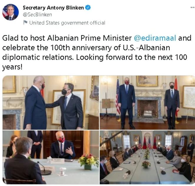 Ndërsa Sekretari Blinken, në një postim në Twitter pas takimit me kreun e qeverisë shqiptare, shkruan se “me kënaqësi prita Kryeministrin Edi Rama për të festuar 100-vjetorin e marrëdhënieve diplomatike SHBA-Shqipëri. Mezi presim 100 vitet e ardhshme”.