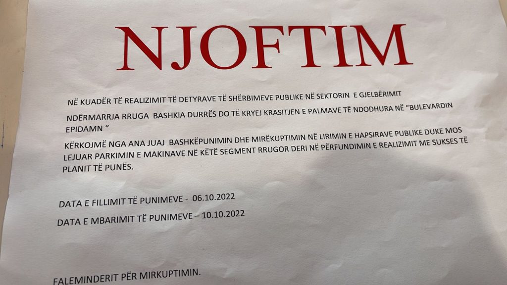 Ndërmarrja Rruga Bashkia Durrës njofton se ditën e enjte do të nisë krasitja e palmave në Bulevardin “Epidamn”, nga “Torra Veneciane” te Vila “Brais”.