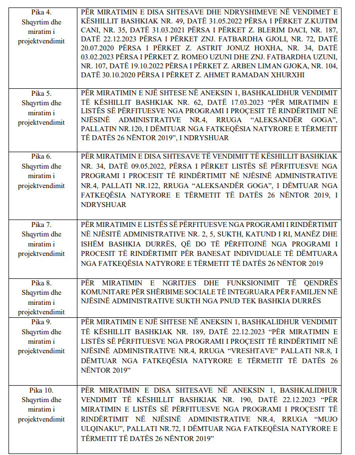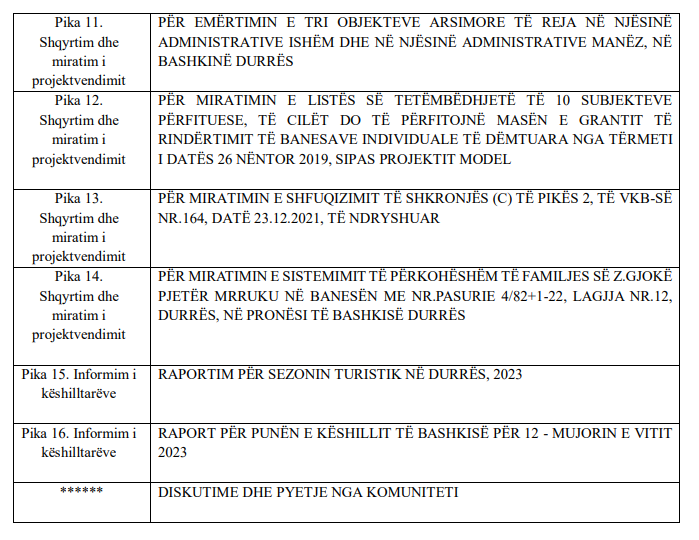 Ditën e martë, datë 06.02.2024, ora 12:00, Këshilli Bashkiak Durrës do të mbajë një mbledhje të radhës, ku në rend dite janë 16 pika: