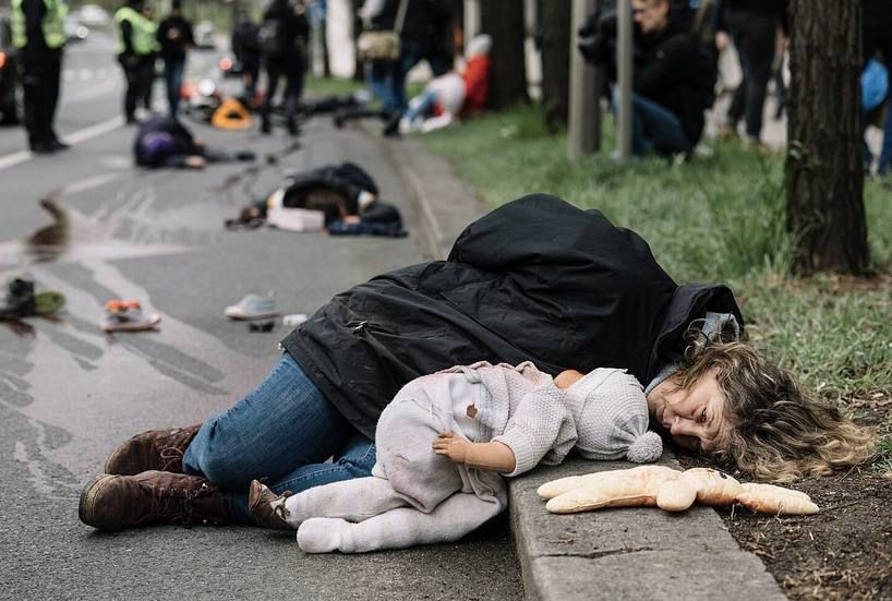 Të shtrirë në mes të rrugës, pa lëvizur dhe të mbuluar me “gjak”, ata kanë inskenuar një copëz të vogël të pamjeve të tmerrshme që po shohim ditët e fundit nga Bucha.
