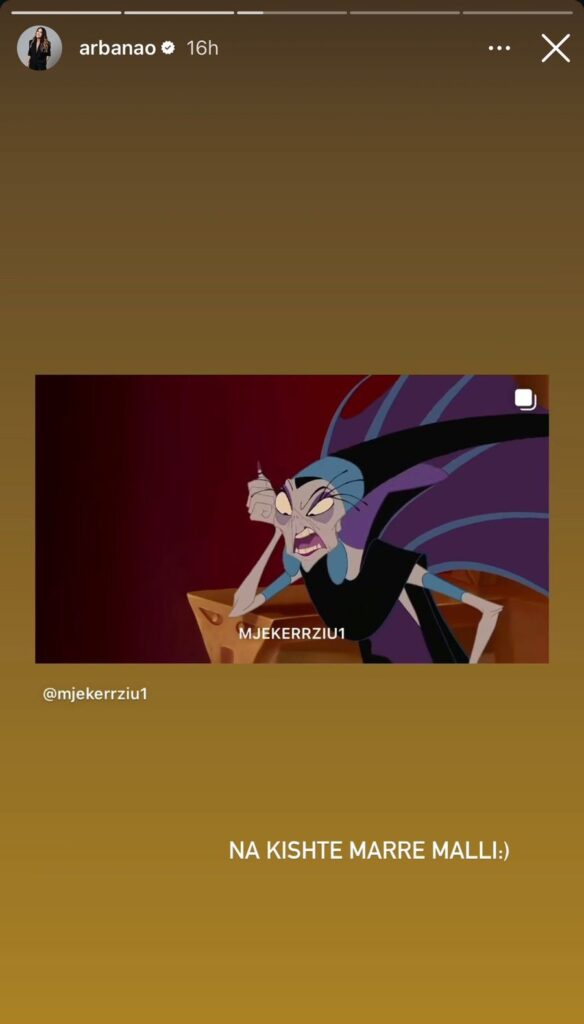 Në story-n e saj në Instagram, Arbana ndau një video nga @mjekërrziu1, i cili vendos fjalë nga emisionet, këngë apo prodhime të ndryshme shqiptare, në sinkron me kukullat e animuara.