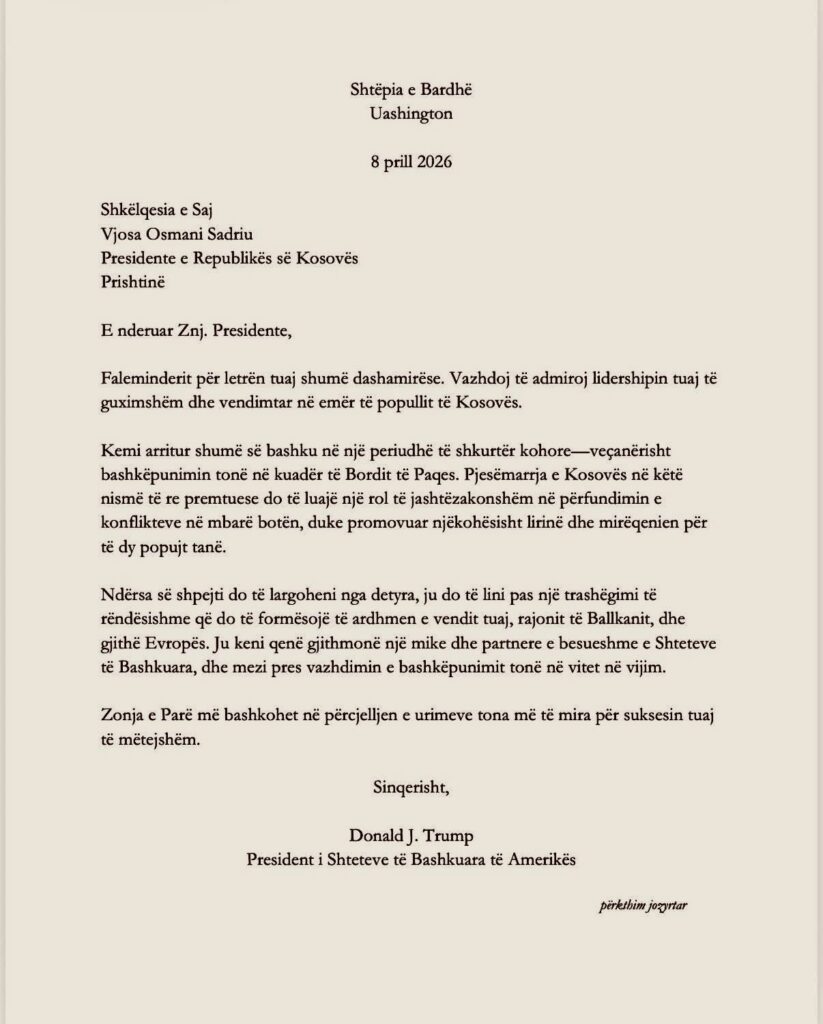 Në përfundim të mandatit të saj, ish-presidentja e Kosovës, Vjosa Osmani, ka marrë një letër nga presidenti i Shteteve të Bashkuara të Amerikës, Donald Trump, në përfundim të mandatit të saj.