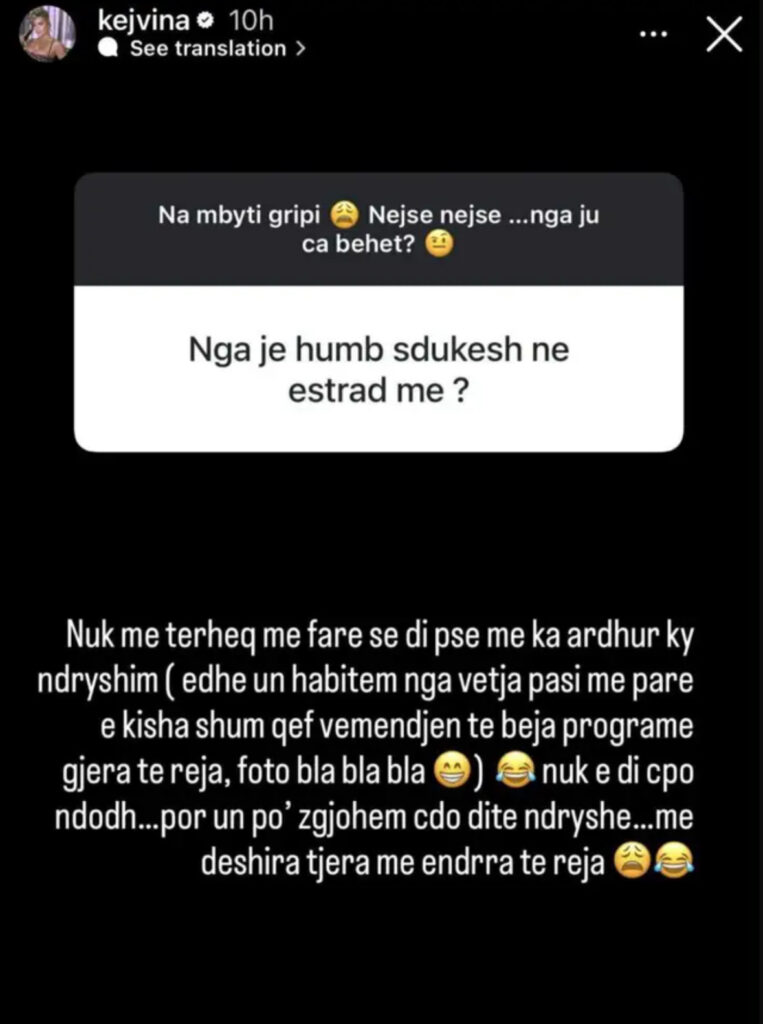 “Nuk më tërheq më fare se di pse më pa ardhur ky ndryshim (edhe unë habitem nga vetja pasi më parë e kisha shumë qejf vëmendjen të bëja programe, gjëra të reja, foto bla bla) nuk e di ç’po ndodh.. por unë po zgjohem çdo ditë ndryshe … me dëshira tjera me ëndrra të reja”, ka shkruar ajo në përgjigjen e saj.”