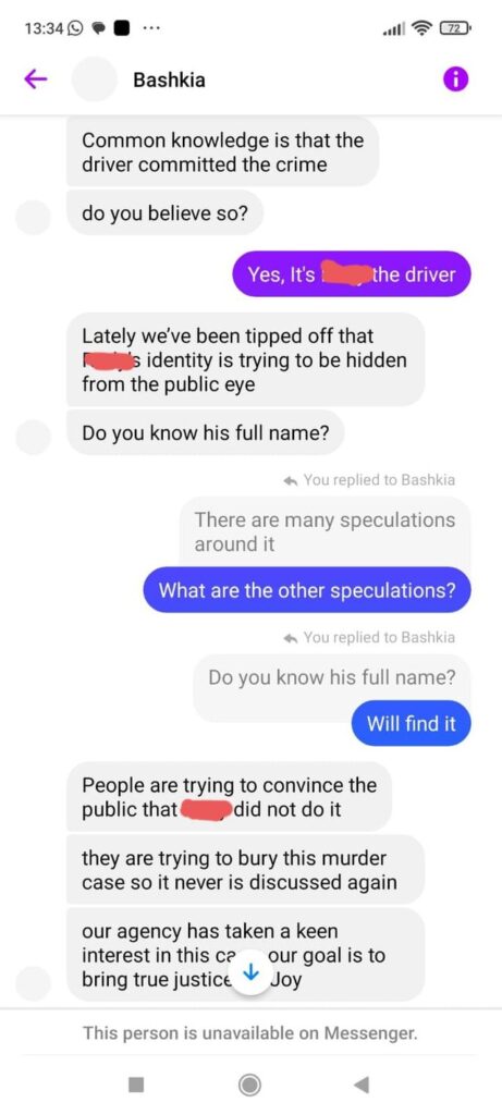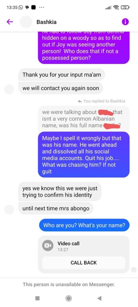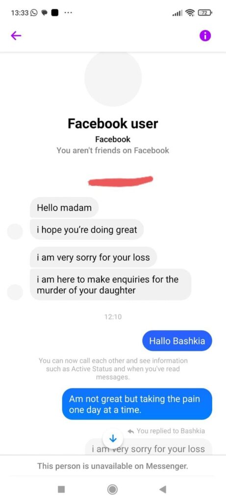 Po ashtu, News 24 është kontaktuar nga nëna e vajzës keniane. Ruth Abongo deklaron se pak kohë më parë, një adresë me emër “fake” në facebook e quajtur “bashkia” i ka shkruar Ruth Abongos duke iu prezantuar si një “agjenci” që po investigon çështjen e Xhoit duke i thënë se po kryejnë hetime për vrasjen me qëllimin që të bëhet drejtësi.