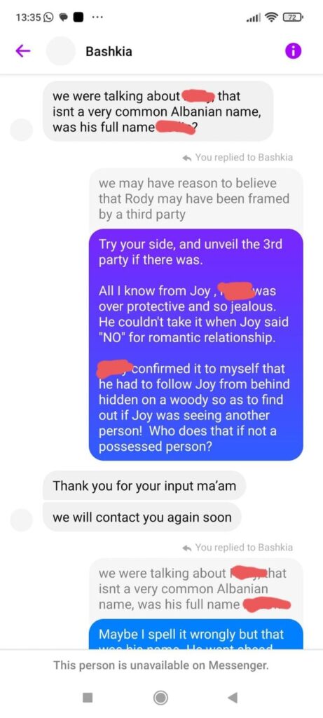 Sipas nënës së Xhoit, ajo dyshon se personi që i shkroi në këtë adresë mund të jetë një nga autorët, bashkëpunëtorët apo ndonjë i penduar i përfshirë në ngjarjen e rëndë.