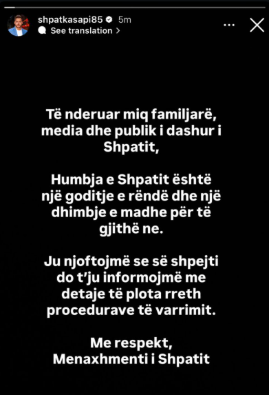 Në rrjetin social zyrtar të këngëtarit, shkruan se humbja e Shpat Kasapit ishte një goditje e rëndë dhe një dhimbje e madhe për të gjithë ne.