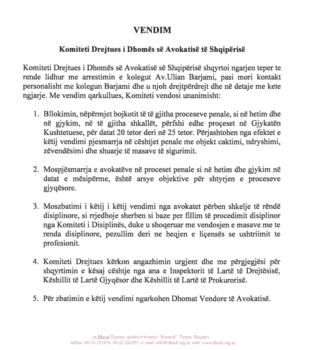 Komiteti Drejtues i Dhomës së Avokatisë së Shqipërisë do të bojkotojë për 5 ditë të gjitha proceset gjyqësore. Ky vendim ka ardhur pas arrestimit të avokatit Ulian Barjami.