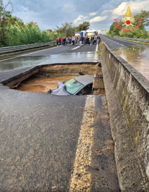 Shembja shkaktoi një hendek disa metra të lartë në sipërfaqen e rrugës, e cila preku të dy karrexhatat. Ngjarja ka ndodhur në zonën e Lamezia Terme, e cila është prekur veçanërisht nga vala e motit të keq të orëve të fundit. Drejtuesi i makinës, ka arritur të shpëtojë pa pësuar dëmtime kur u hap gropa.