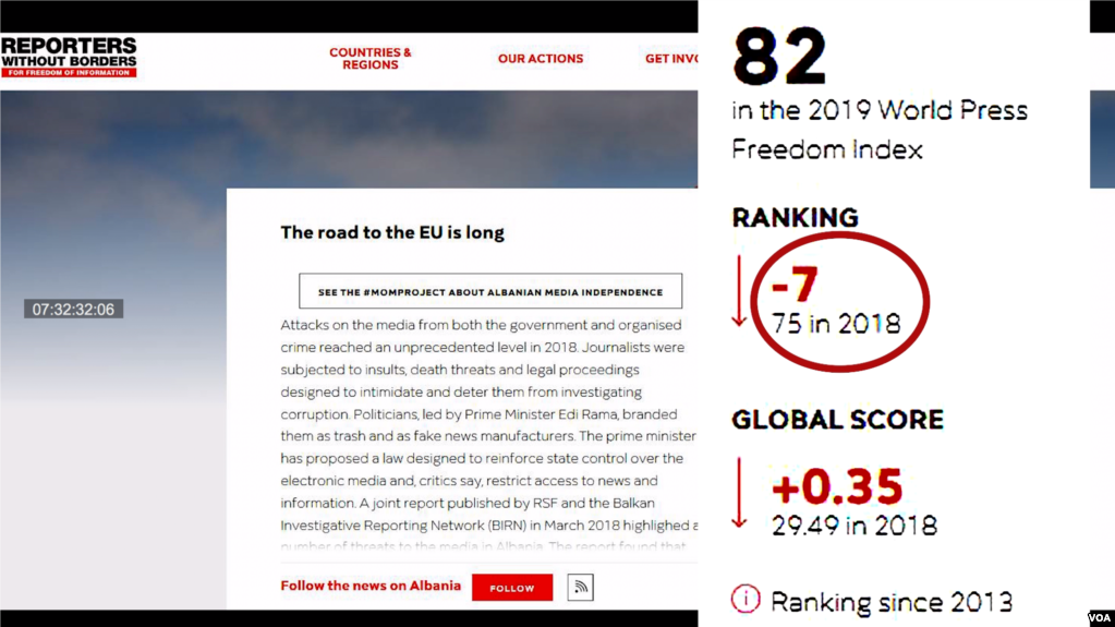 Në raportin e fundit të Reporterëve pa Kufij, Shqipëria humbi 7 vende për lirinë e medias. Ai nënvizoi se pati sulme ndaj medias si nga qeveria edhe nga krimi i organizuar në një shkallë të pashëmbullt. “Politikanët e udhëhequr nga kryeministri Edi Rama i cilësuan gazetarët kazan dhe prodhues lajmesh të rreme”- thuhej në raport. Në një reagim të menjëhershëm Kryeministri tha se me këtë qeveri s’ka media të shantazhuar dhe liri të mohuar.
