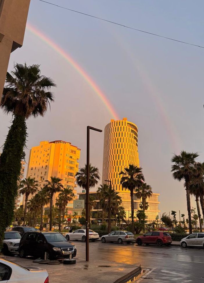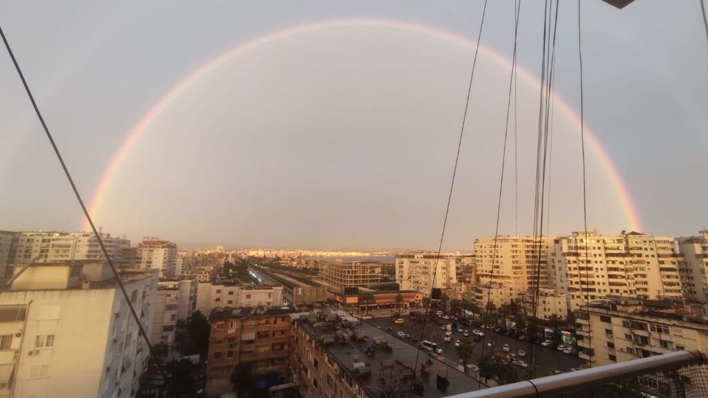 Një pamje e rrallë është shfaqur pasditen e së enjtes mbi qiellin e Durrësit. Pas reshjeve të shiut, një ylber i dyfishtë është formuar mbi qytet, duke tërhequr vëmendjen e qytetarëve.