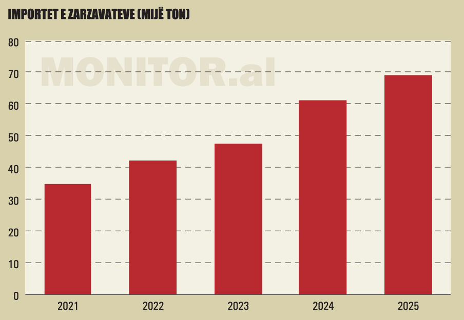 Prodhimi vendas po humbet terren me shpejtësi përballë importit. Raftet e marketeve dhe tezgave ndajnë hapësirën në favor të importeve. Të dhënat e INSTAT tregojnë se në vitin 2025, sasia e zarzavateve të importuara u rrit me 14% në krahasim me 2024, ndërsa në harkun e 5 viteve janë dyfishuar.