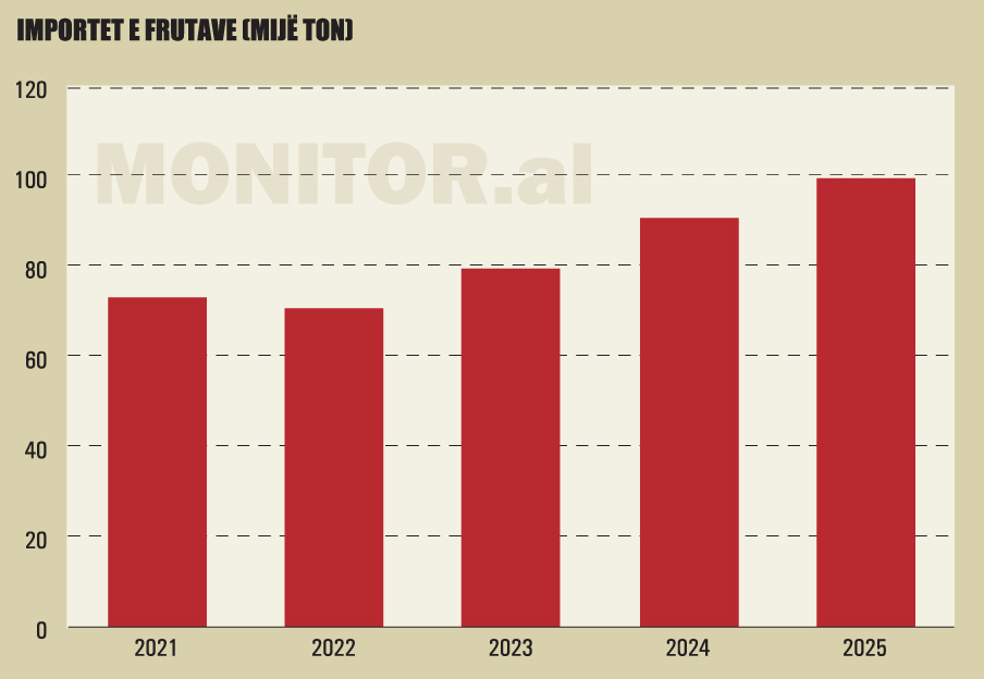 Megjithatë, frutat si dardha dhe hurma janë pothuajse tërësisht të varura nga importi, me çmime grumbullimi prej 210 lekësh që përkthehen në 300 lekë për konsumatorin. Kjo tregon se pa një mbështetje më të fortë për frutikulturën vendase, konsumatori do të mbetet peng i çmimeve të diktuara nga tregjet e huaja dhe kostot e transportit.