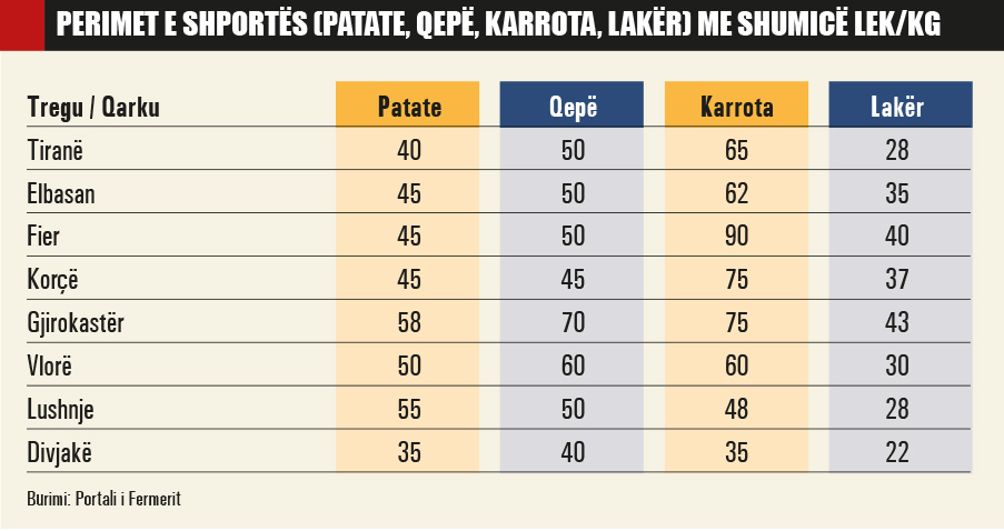 Edhe ato që historikisht njihen si produkte të lira, si patatja dhe qepa, nuk po i shpëtojnë trendit rritës. Me një çmim shumice prej 40 lekësh, ato arrijnë në 80 lekë në pakicë.