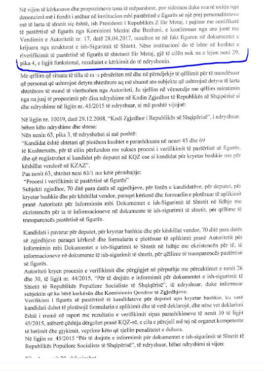 ‘Në vijim të kërkesave dhe propozimeve tona të mëparshme, por sidomos duke marrë nxitje nga denoncimi më i fundit i ardhur në institucion mbi pastërtinë e figurës së një prej personaliteteve më të lartë të shtetit, siç është ish-presidentit i Republikës, Ilir Metaj, i pajisur me vertifikatë të pastërsisë së figurës nga Komisioni Mezini dhe Bezhani, e konformuar nga ana jonë me vendimin e autoritetit nr. 17, datë 28.04. 2017, rezulton se në fakt figuron në dokumentet e krijuara nga strukturat e ish-sigurimit të shtetit. Nëse institucioni do të ishte në kushtet e riverifikimit të pastërtisë së figurës së shtetasit Ilir Meta, gjë të cilën nuk na e lejon neni 29, pika 4, e ligjit funskional, rezultatet e kërkimit do të ndryshonin’. Ju përcjellim informacionin në lidhje me rastet më flagrantë të konstatuara nga institucioni, ku disa figura të rëndësishme, si A.D, Th.S, S.H, Xh.Sh, D.Ç dhe I.M, të cilat kanë pasur certifikatë të pastërtisë së figurës, figurojnë në dokumentet e krijuara nga ish-sigurimi i shtetit, raste të cilat duhet të mbahen parasysh në vlerësimin tuaj në lidhje me miratimin nga ana e Kuvendit të propozimeve për ndryshime ligjore.’, thuhet në dokument.