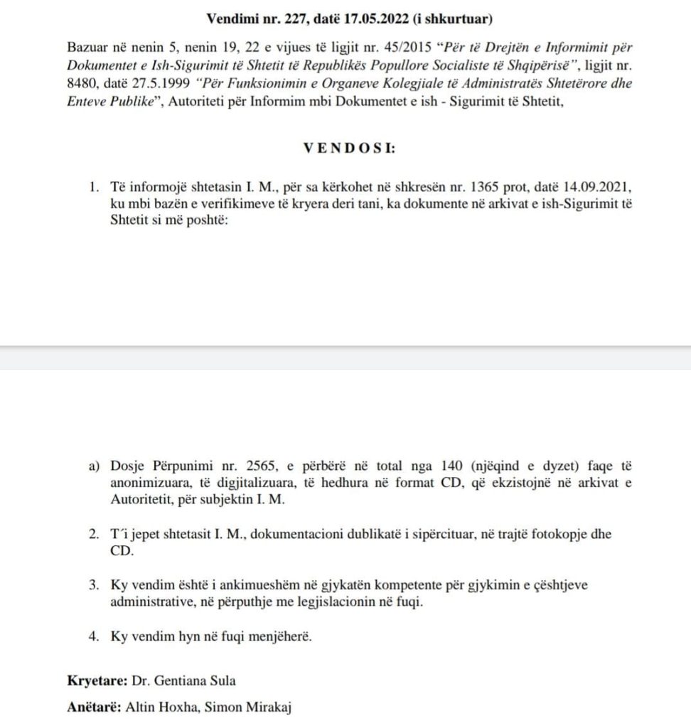Ndërkohë një orë më herët, Autoriteti i Dosjeve ka publikuar në Facebook, një dokument sipas të cilit I.M. është vendosur në dijeni për këtë çështje. Madje sipas këtij dokumenti, I.M. i është dorëzuar materiali prej 140 faqesh që figuron në dosjet e ish-sigurimit të shtetit. Këto vendime, sipas dokumentit të publikuar, janë marrë që në 17 maj të këtij viti.