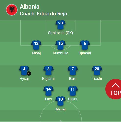 SHQIPËRI: Strakosha, Mihaj, Kumbulla, Gjimshiti, Hysaj, Trashi, Bare, Laçi, Bajrami, Uzuni, Manaj. Trajner: Edi Reja.