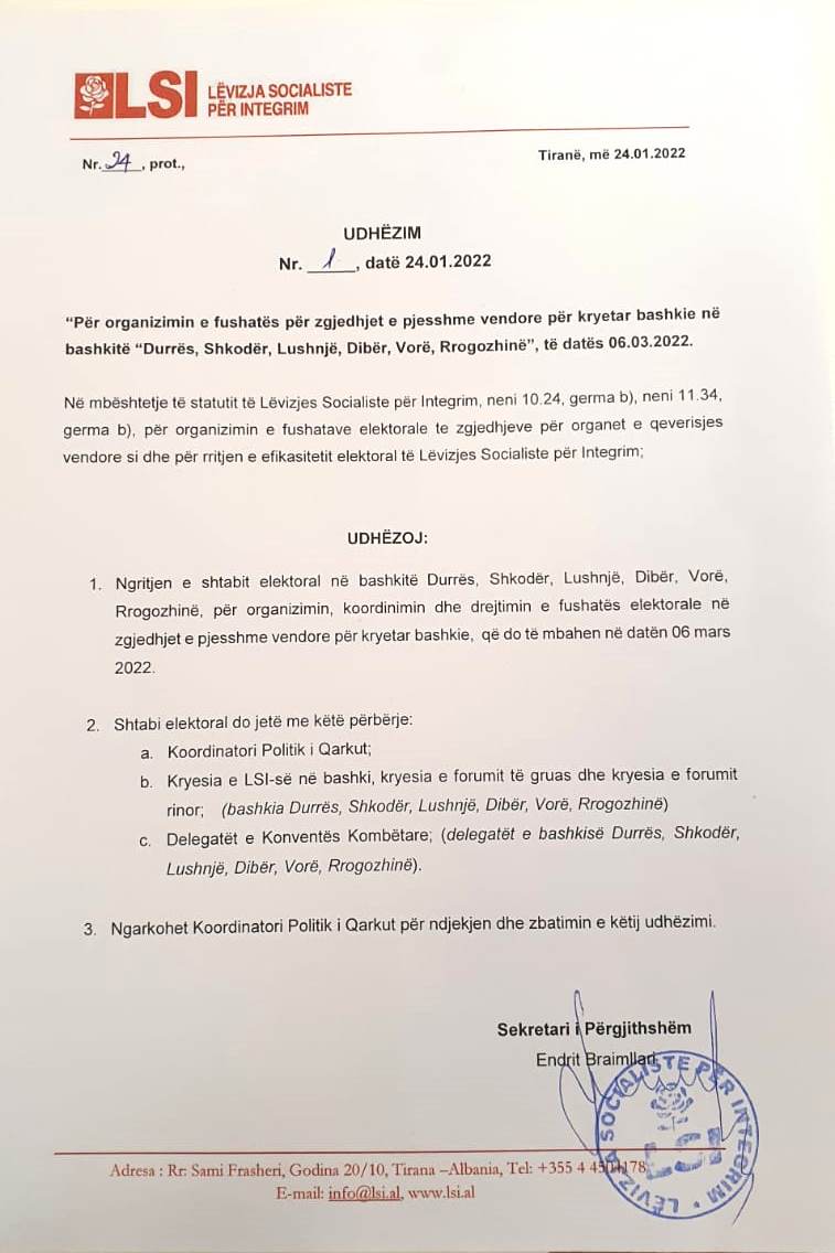 “Për rritjen e efikasitetit elektoral të Lëvizjes Socialiste për Integrim, udhëzoj ngritjen e shtabit elektoral në këto 6 bashki.”- parashikon udhëzimi i shpërndarë në struktura.